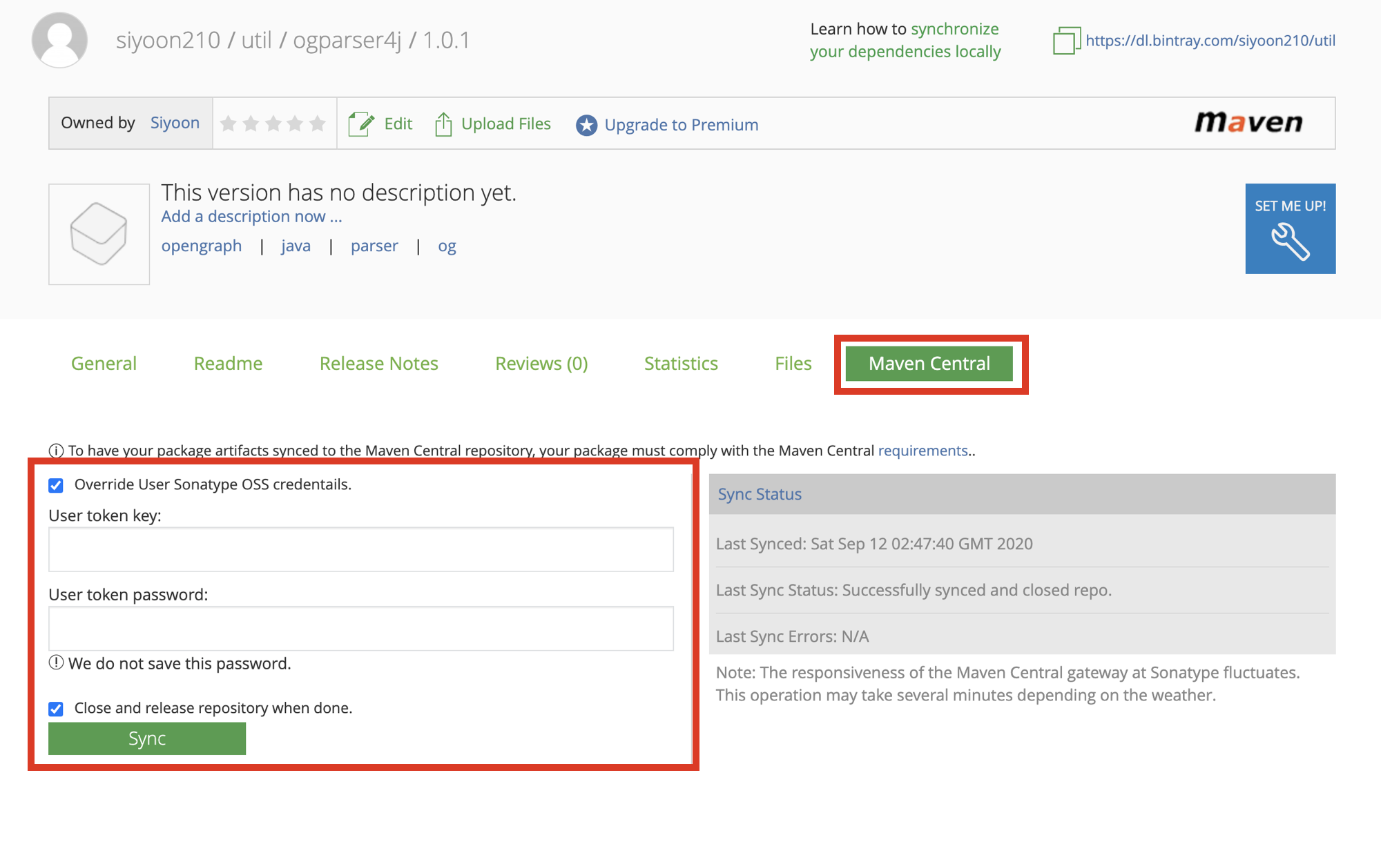 - Sync하고자 하는 패키지의 버전 상세페이지로 이동합니다.(상세페이지 주소는 https://bintray.com/유저아이디/저장소이름/패키지이름/버전명 형태입니다.)