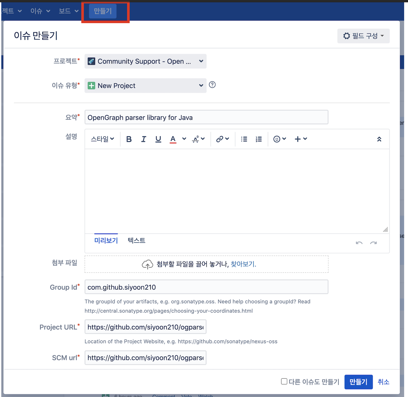 - 프로젝트는 'Community Support - Open Source Project Repository Hosting (OSSRH)', 이슈 유형은 'New Project'로 합니다.