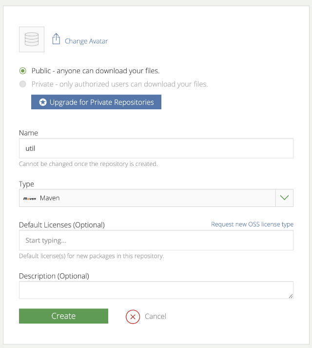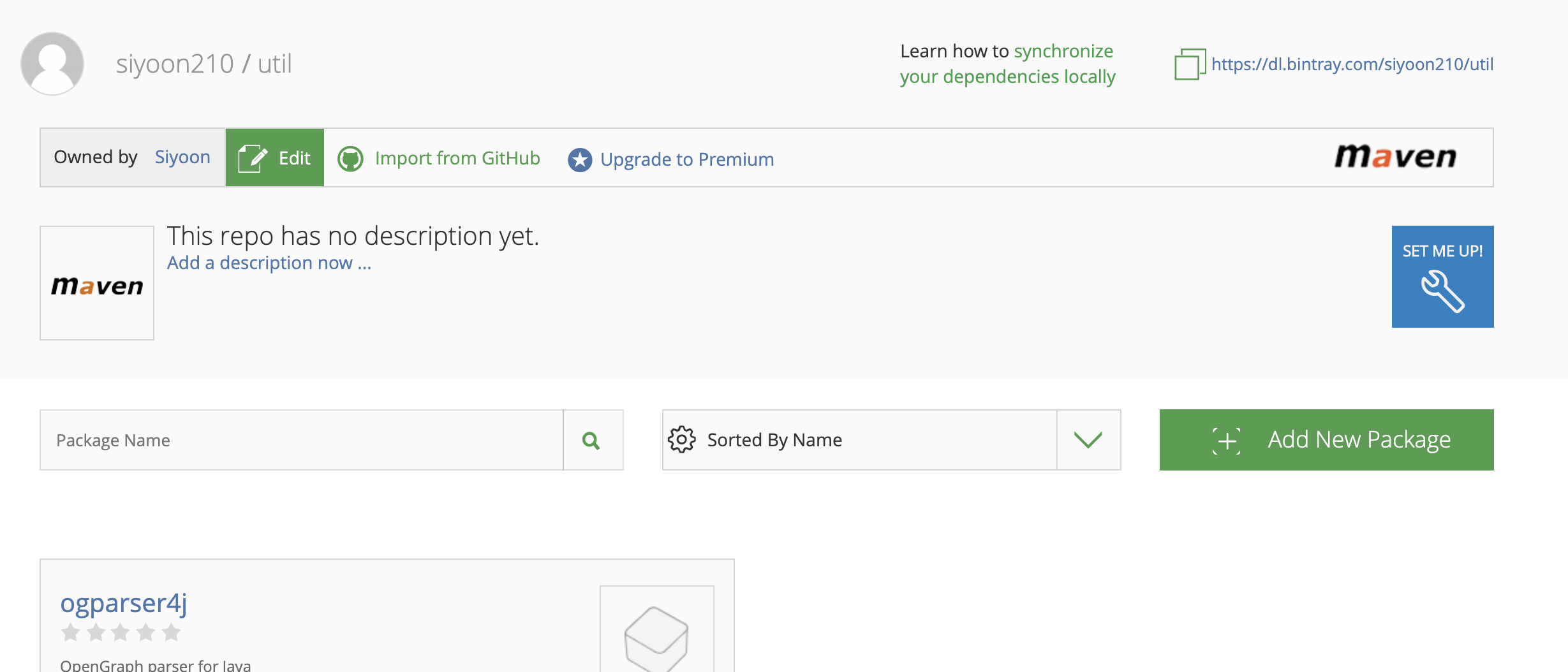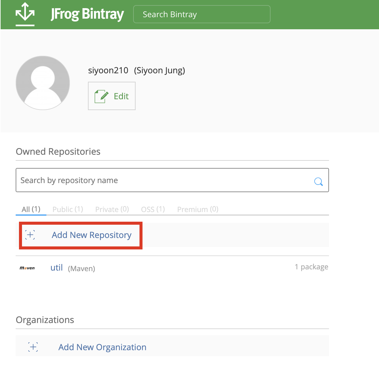 - 하나의 Repository에 여러 라이브러리를 업로드 할 수 있으므로 범용적인 이름을 사용합니다. (이름으로 고민하고 싶지 않다면 그냥 maven으로 하면됩니다. 대부분 maven으로 하더라구요.. 저는 util이라는 이름으로 했습니다.)