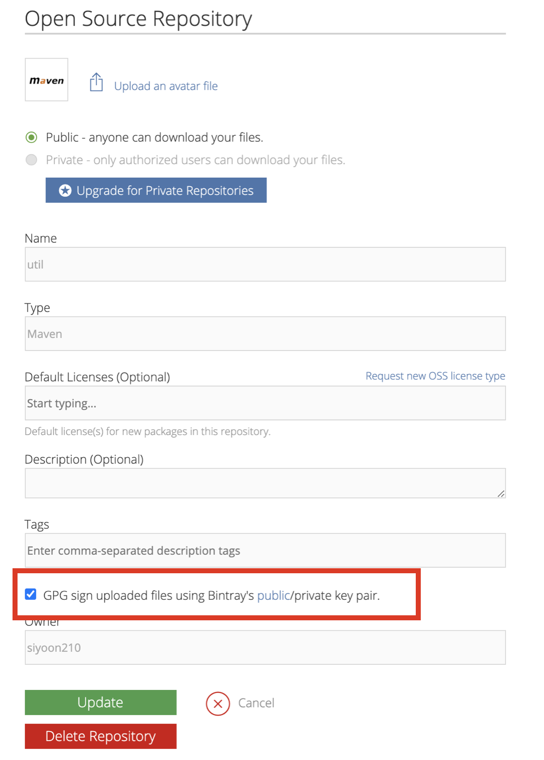 Step 6. Bintray에 업로드한 GPG key로 서명하도록 설정하기