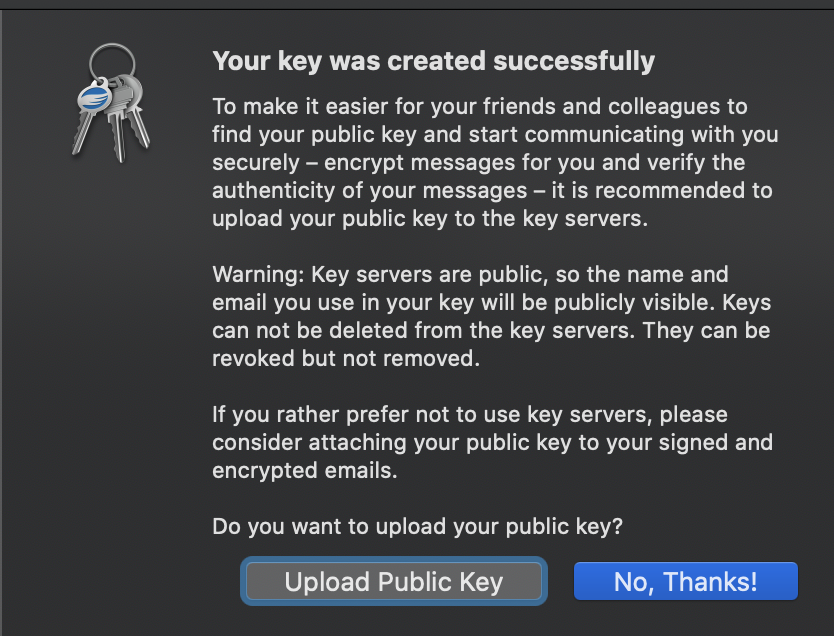 - 위 링크는 Mac 사용자만 가능한 것 같습니다. 다른 운영체제를 사용하시는 분들은 GPG Key 생성에 대한 다른 문서를 참고해주시기 바랍니다. GPG Key 생성후에 사용할 'Public Key'를 뽑아낼 수 있다면 충분합니다. (서버에 업로드할 필요 없음)