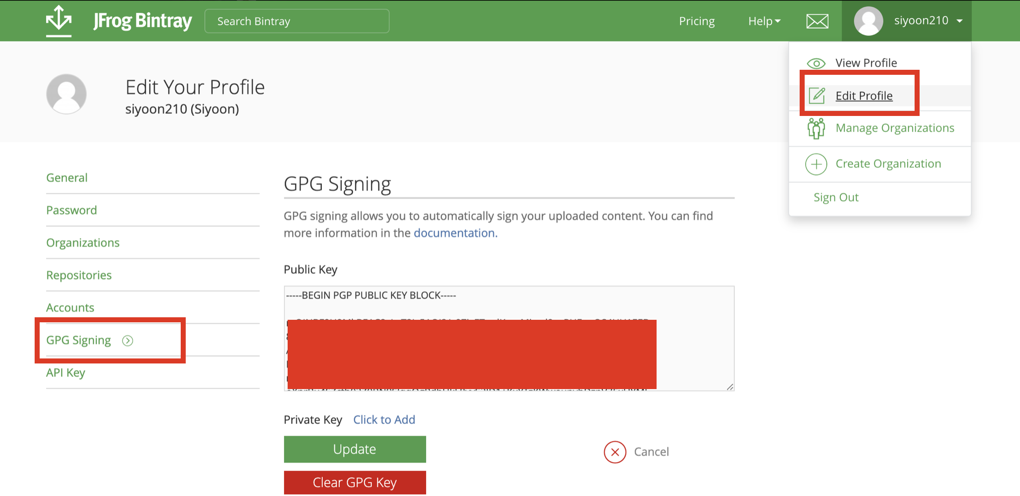 - 우측 상단 'Edit Profile' - 'GPG Signing' 으로 들어가서 복사한 Public Key를 등록하고 'Update'를 눌러줍니다.