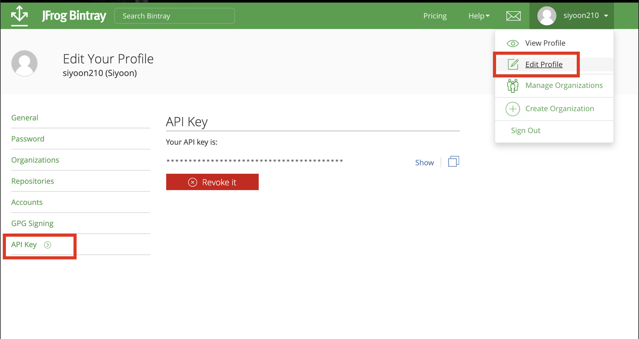 - API key는 'Edit Profile' - 'API Key' 에서 확인 가능합니다.