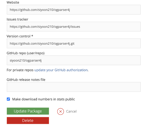 - 패키지 Edit 페이지 하단 Github repo에 깃헙정보를 다음과 같은 형태로 적는다. 작성후 Update Package