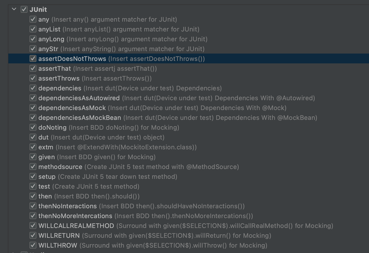 템플릿에 미리 사용할 구현체를 선언하여 테스트 코드를 작성할 때 import 선언 과정없이 매끄럽게 작성 할 수 있다. 특히 나같은 경우는 assertThat()은 assertJ의 API를 사용하지만 assertThrow()나 assertDoesNotThrow()는 junit jupiter에서 제공하는 API를 사용하기 때문에 유용하게 사용하고 있다.